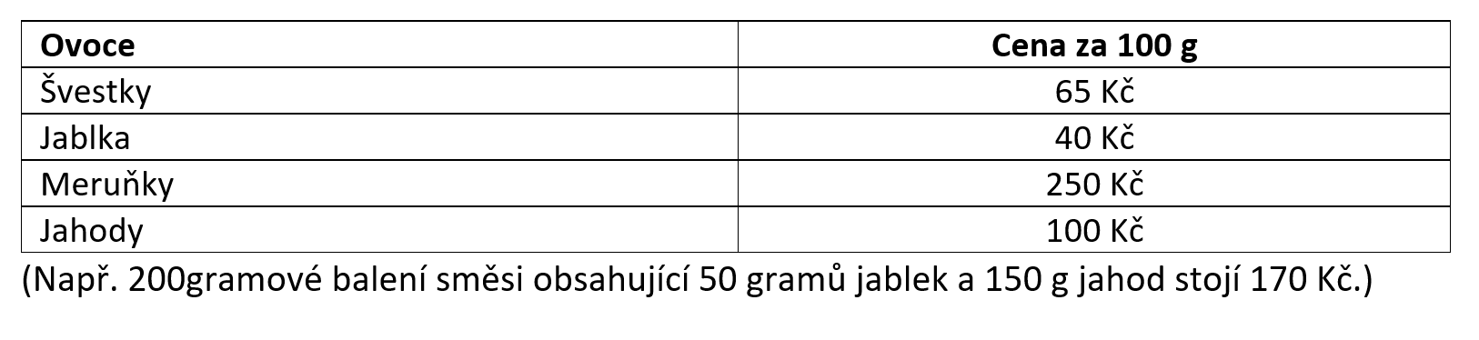 Ve stánku na trhu je možné si koupit různé směsi sušeného ovoce. Cena směsi závisí pouze na hmotnosti a ceně surovin, které jsou použity. V tabulce jsou ceny různých druhů sušeného ovoce za 100 g ovoce.