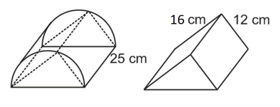 Trojboký hranol, jehož dvě kratší strany jsou 16 cm a 12 cm je vytvořen z poloviny válce, odříznutím dvou dílů. Výška půlválce je 25 cm. Všechny hrany hranolu leží na povrchu půlválce.