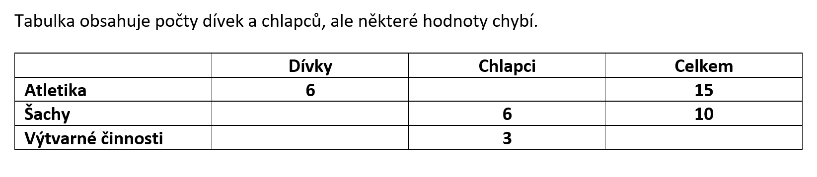 V základní škole děti navštěvují kroužky atletiky, šachu a výtvarné činnosti. Poměr počtu dětí chodících na atletiku a dětí chodících na výtvarné činnosti je 5 : 4.