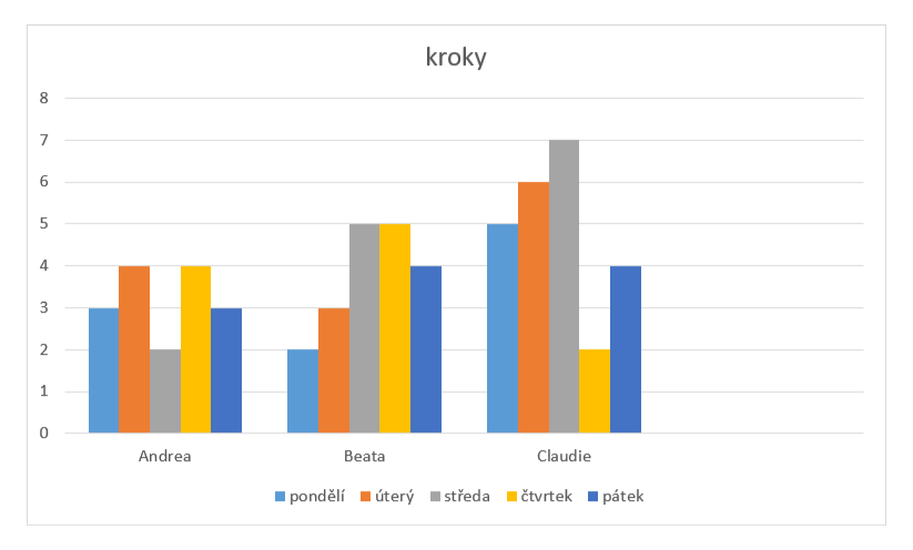 Místní zverimex vypsal soutěž pro týmy. Když tým ujde za den dohromady minimálně 10 000 kroků věnuje do útulku „Chlupáči v nouzi“ 10 kg granulí. Děvčata z 5. ročníku Andrea, Beata a Claudie se zapojili a první týden ušli tyto kroky. V grafu jsou uvedeny kroky zaokrouhleny na tisíce.