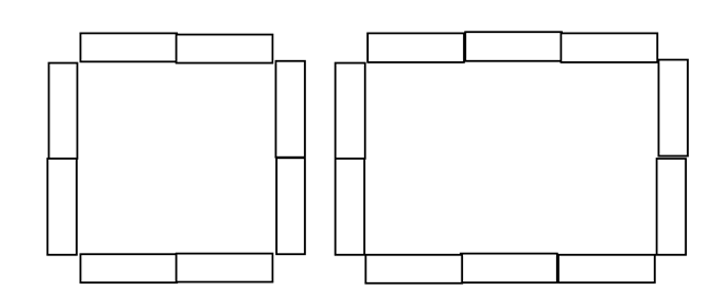 Z jednotlivých obdélníčků pak Evžen poskládal čtverec s podstavou dlouhou 8 cm a obdélník, tak jak je to na obrázku. Víme, že Evžen použil všechny obdélníčky.