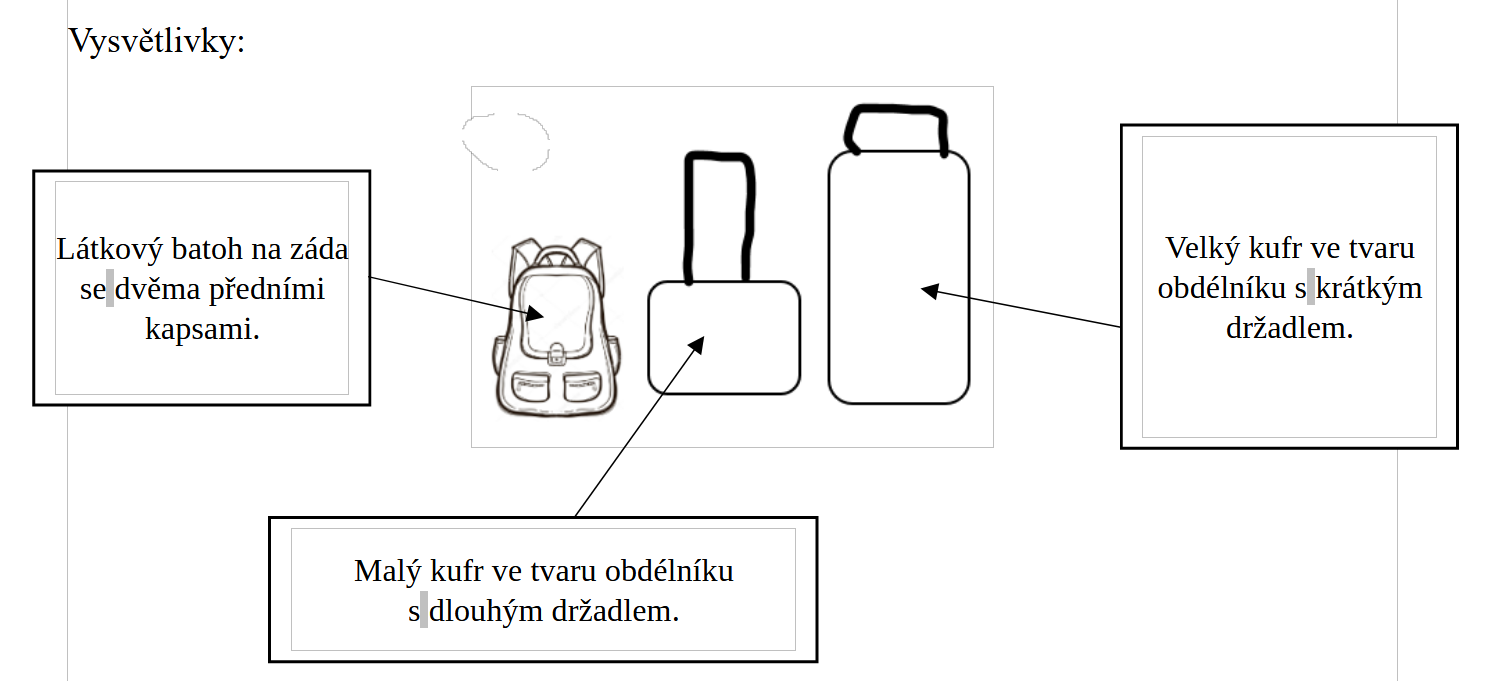 (Žádnou možnost z nabídky A–F nelze přiřadit víckrát než jednou. Dvě možnosti zbudoua nebudou použity.) A) Velký kufr ve tvaru obdélníku má dlouhé držadlo. Malý kufr ve tvaru obdélníku má dlouhé držadlo a batoh na záda má obě přední kapsy bílé.