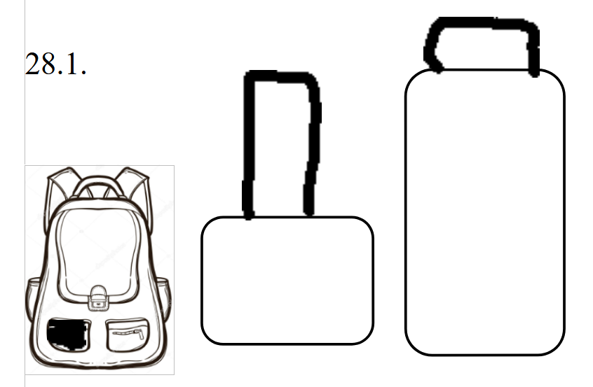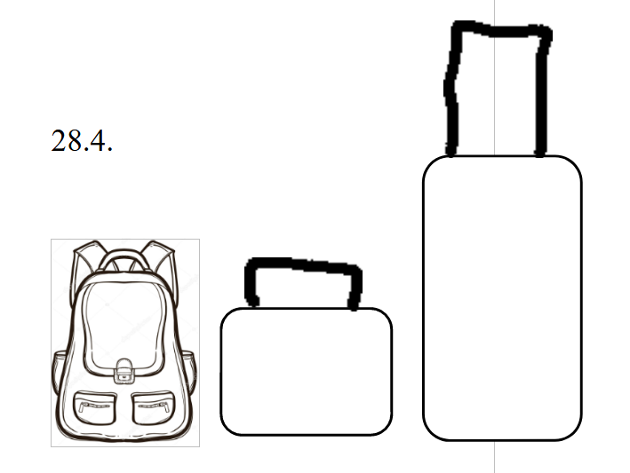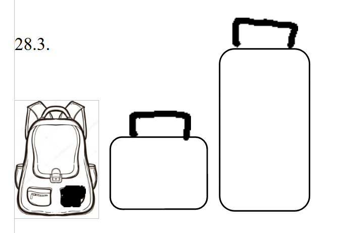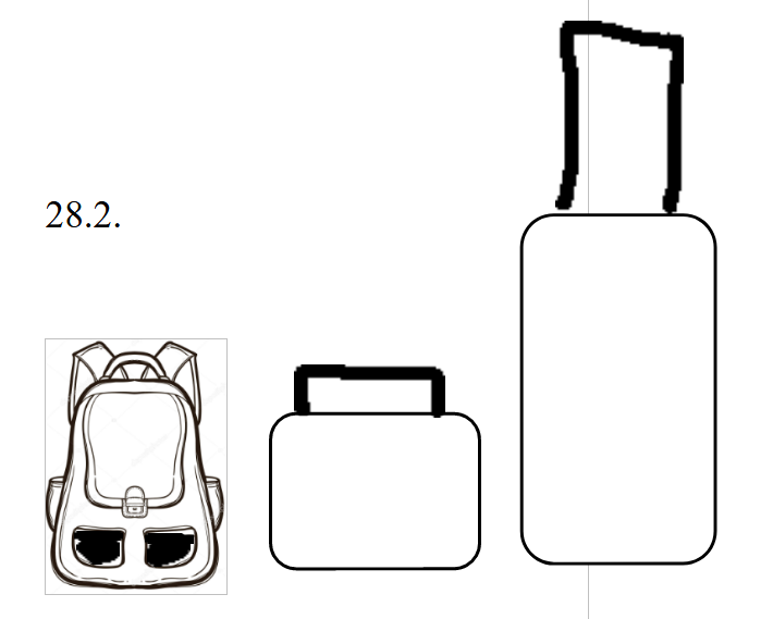 E) Velký kufr ve tvaru obdélníku má dlouhé držadlo. Malý kufr ve tvaru obdélníku má krátké držadlo a batoh na záda má obě přední kapsy bílé.