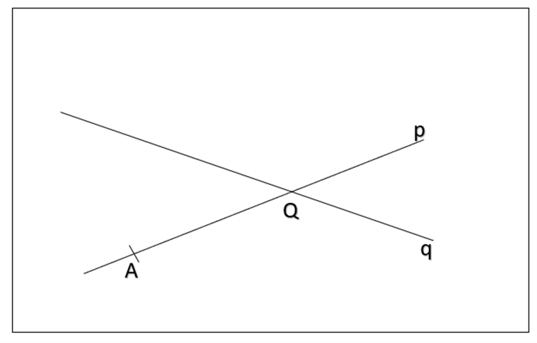 V rovině leží různoběžné přímky p a qa body A a Q. Bod A leží na přímce p a bod Q je průsečíkem obou přímek.