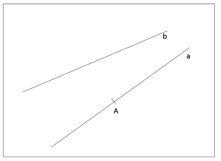 V rovině leží přímky a, b a bod A, který leží na přímce a.