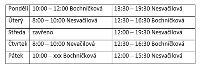 Do kolika hodin je v ordinaci paní Bochníčková v pátek, jestliže týdně má v ordinaci o 10 hodin méně než paní Nesvačilová?