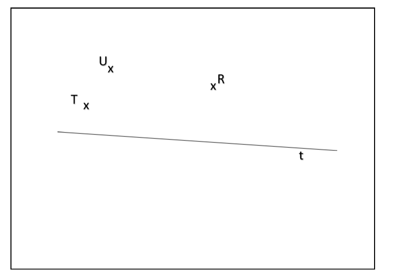 V rovině leží přímka t a body T, U, R, které leží mimo ni.