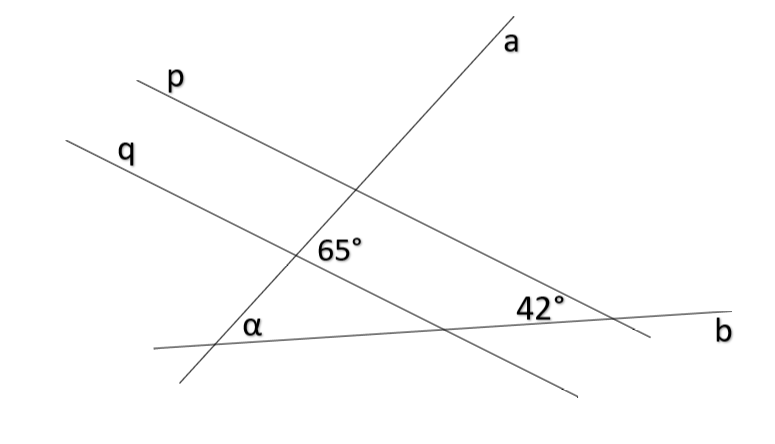 Na přímce q leží vrchol Q a na přímce p leží vrchol R. Velikost vnitřního úhlu PQR je 30°.